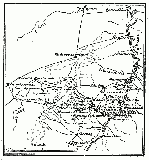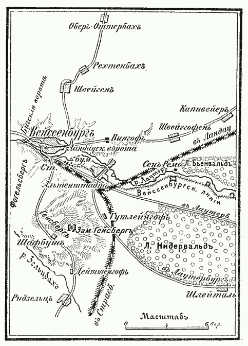 Протекающая через Вейсенбург р. Лаутер не служила серьезным препятствием для противника: ближайшие два моста, обыкновенный и железнодорожный, находились в Альтенштадте, в 1 вер. от Вейсенбурга.