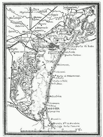 Иногда военные действия доходили и до самого города: в 1379 г., после поражения венецианской эскадры при Поле, генуэзский флот, под началом Петра Дории, подошел к Венеции, но нашел все входы укрепленными. Дория высадил на о. Киоццо сильный корпус и в начале августа приступил к обложению. 16 августа был взять Киоццо, чем открыт вход в лагуны, а вскоре после того и о. Маламокко (кроме ф. Лидо).