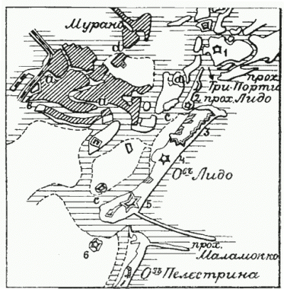 | 1 – форт Эразм. 2 – форт С.-Андреа .3 – Лидо (Св. Николай). 4 – Катро-Фонтане. 5 – Альбероне. 6 – С.-Пьетро.aa – Большой канал. ab – канал Джудекка. cc – канал Маламокко. dd – канал Мурани. |