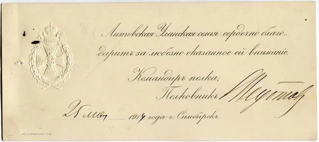 Благодарственное письмо командира 5-го Уланского Литовского полка.