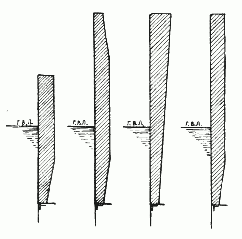 1) Бортовая поясная броня состоит из отдельных стальных плит дл. 10-12 фт. и высотою от 7 (броненосцы старого типа) до 12 фт. (современные линейные корабли). Как показано на фиг. 1, поперечное сечение (профиль) плиты для выигрыша в весе делается с утонением в нижней подводной части её: слой воды как бы дополняет недостающую толщину плиты.