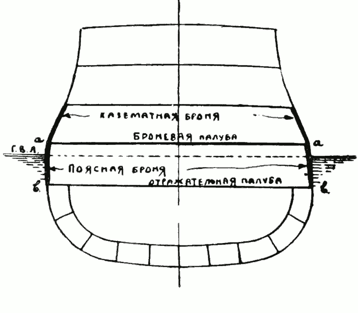 На фиг. 2 поясная броня обозначена буквою А; на старых броненосцах она располагалась только в средней части корабля, защищая машину, котлы и погреба боев. запасов, и в таком случае по концам её ставились поперечные броневые переборки или траверзы такой же толщины и высоты, как и поясная броня. Траверзы защищали указанные жизненные части судна от снарядов, могущих залететь с носа или кормы. На современных броненосных судах поясная броня простирается по всей ватерлинии от носа до кормы, утоняясь к оконечностям, ибо самое опасное — нормальное попадание снаряда в броню — здесь мало вероятно и потеря в плавучести в оконечностях корабля не так для него гибельна, как в широкой ср. части.