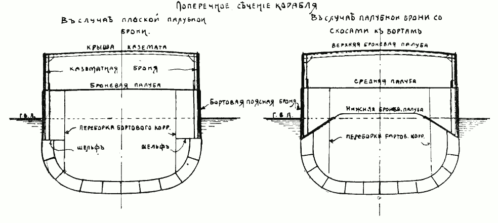 С появлением разрывных снарядов одной броневой палубы оказалось недостаточно, и во всех флотах пришли к убеждению в необходимости по крайней мере двух таких палуб — нижней, со скосами к бортам и верхней — плоской.
