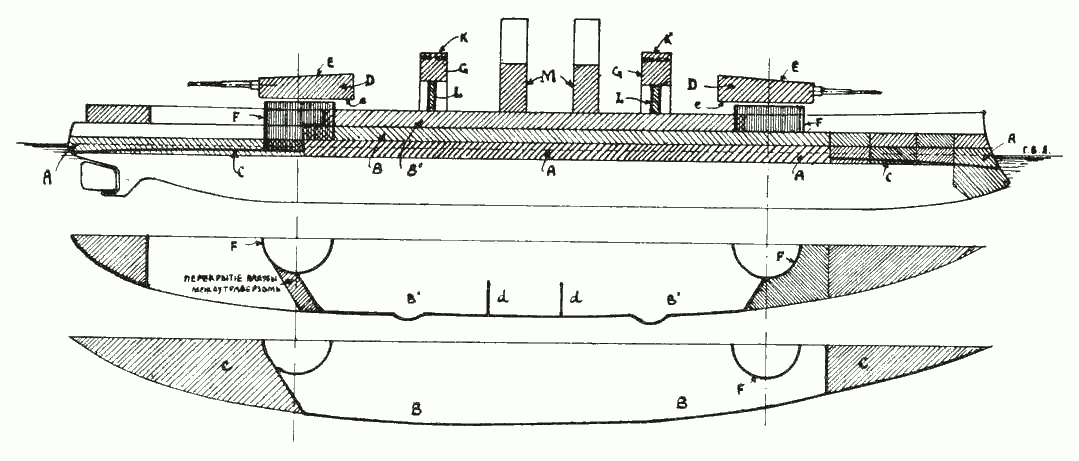 На последних линейных кораблях нашего имперского флота нижние и верхние казематы простираются, подобно поясной броне, по всей длине судна, при чем стараются не делать в броне никаких вырезов (иллюминаторы, выводные отверстия труб и проч.), для обеспечения боевой плавучести и остойчивости судна.
