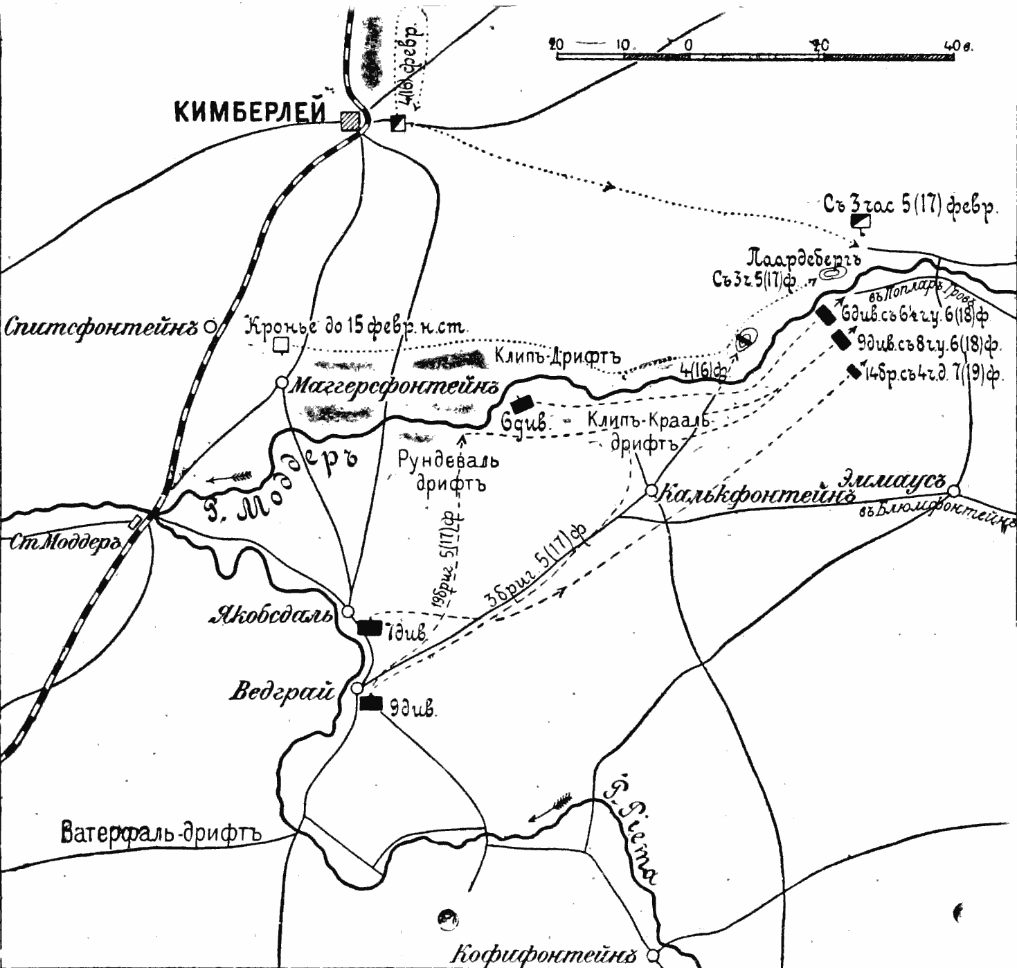 По освобождении Кимберлея 3 февраля английской конницей генерала Френча (см. Кимберлей), остальные части английской армии сосредоточились: 6-я дивизия — на р. Моддер у Клип-дрифта; 7 и 9-я дивизии и корпусные войска на линии Якобсдаль — Ведграй.