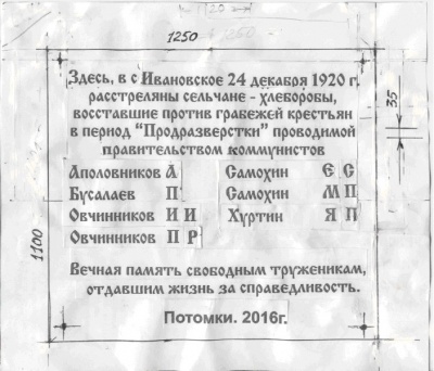 Ранее мы хотели поставить крест на горе, за селом, с памятной плитой на одном из мест расстрела сельчан, но инициатива председателя поставить мемориал на аллее Славы нас так обрадовала и защищенностью места от вандалов, и соседством равнозначным мемориалом погибшим сельчанам в ВОВ.