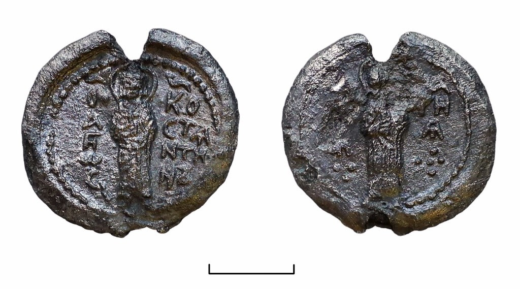 Рядом с фундаментом этой деревянной постройки и была найдена хорошо сохранившаяся свинцовая печать с изображением святых Константина и Марии. Она происходит из культурного слоя, надежно датированного концом XII – началом XIII века.
