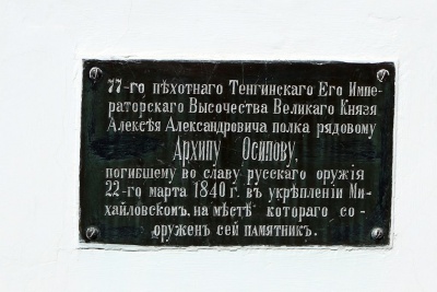 На месте взорванного укрепления высится чугунный ажурной работы крест с надписью: "77-го пехотного Тенгинского Е. И. В. Великого князя Алексея Александровича полка рядовому Архипу Осипову, погибшему во славу русского оружия 22 марта 1840 г. в укреплении Михайловском, на месте которого сооружен сей памятник".