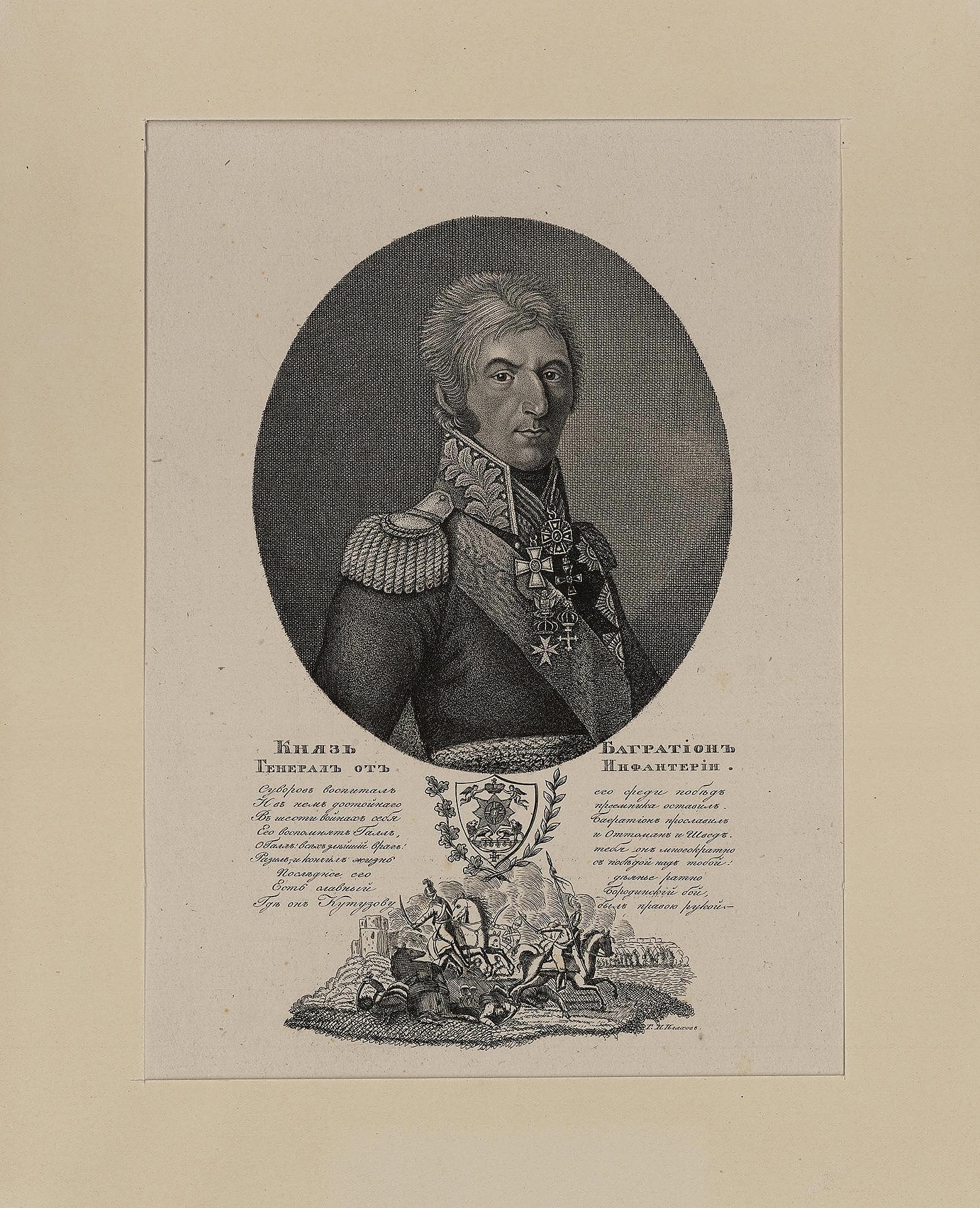 | Портрет генерала, князя П.И. Багратиона. Плахов, Никита. 1758-?. Россия, Санкт-Петербург, Первая четверть XIX в., бумага, гравюра резцом, 37,3х29 см. ГЭ |