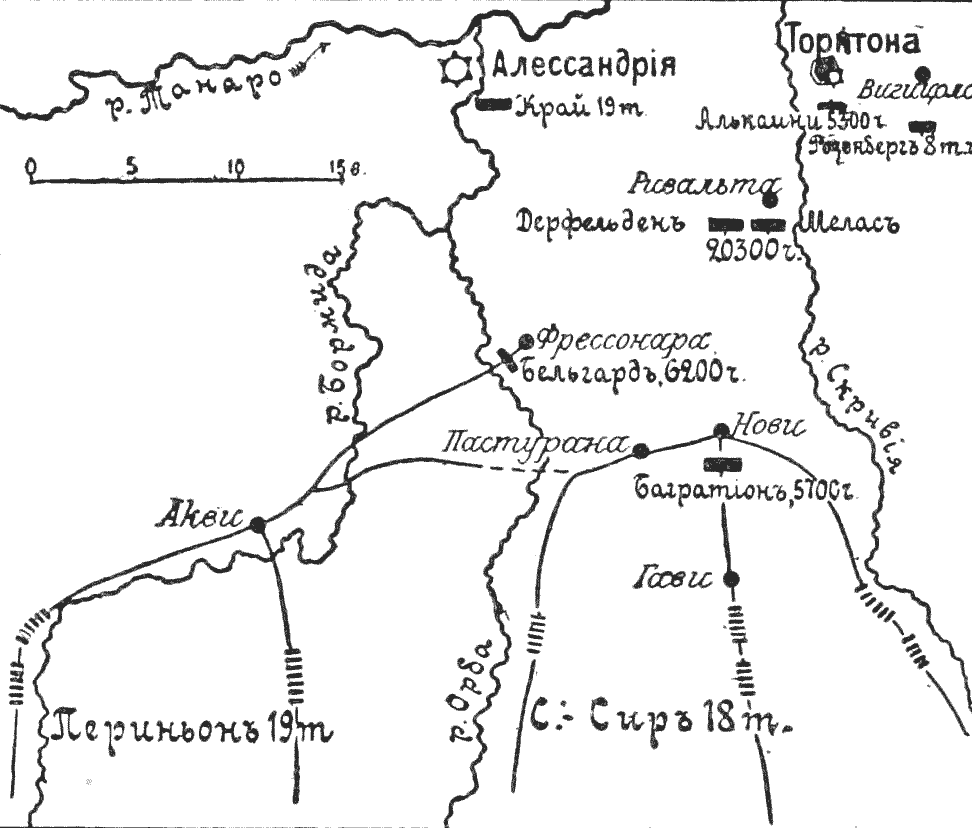 В ожидании дебуширования французов, союзная армия 1 августа расположилась: авангарды, Бельгарда (6.200 чел.), — впереди Фрессонары; Багратиона (5.700 чел.) — впереди Нови, по дороге к Гави, и Розенберга (8 т. чел.) — у Вигицола.