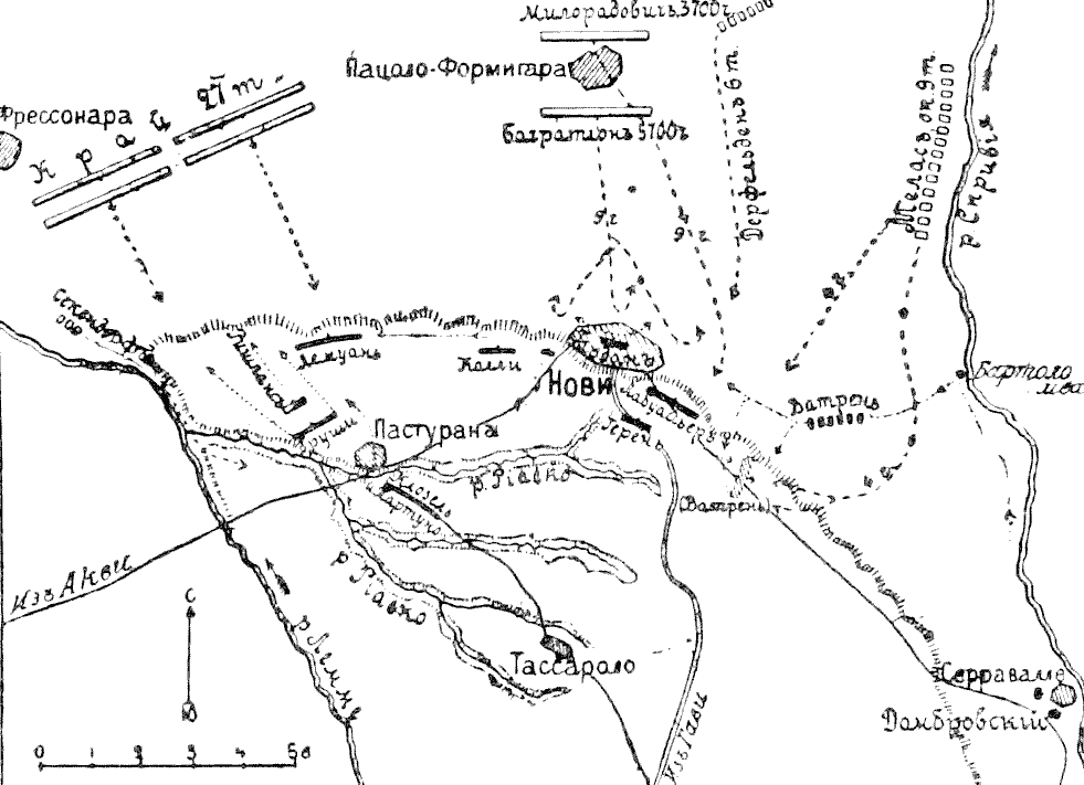 В 9 вер. южнее Нови, на высотах Монто-Мелезимо, имелась хорошая арьергардная позиция. Путей отступления было 4, неудобных и по своему качеству и по направлению.