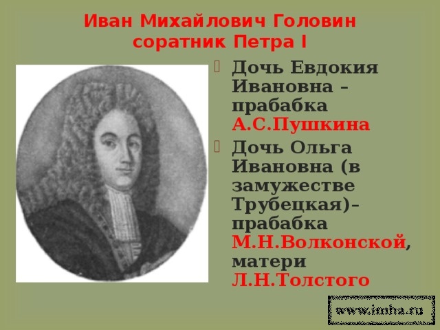 Но главным фактором здесь является именно его прародители - И.М.Головин и М.Б.Глебова. И это совсем не случайность, что подтверждается именем Л.Н.Толстого.