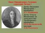 О Пушкинской линии. Прадед Пушкина А.С. — каптенармус (в воинском подразделении заведующий хозчастью личного состава) Преображенского полка Александр Петрович Пушкин женился на Евдокии Ивановне-дочери Ивана Михайловича Головина и Марии Богдановны Глебовой, помещиков села Копаново. Их дети-Мария и Лев. Лев Александрович(дед), у него сын Сергей Львович-отец Пушкина А.С. Историки обычно при описании родословной поэта, начинают с Арапа Петра-I.