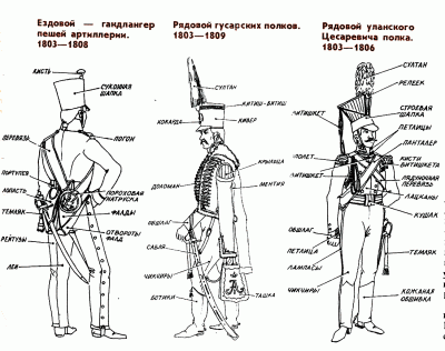 В уланском мундире просматривается очень много польских элементов одежды. Короткие синие куртки с цветными лацканами и обшлагами «мыском», выпушками по швам рукавов и спины, «польский» тип фалд, позднее замененный фалдами кирасирского образца, но в 1814 году вновь восстановленный. Куртку украшали эполеты — желтые или белые гарусные у рядовых, серебряные или золотые у офицеров. Длинные чакчиры — синие с цветными лампасами (вроде нынешних генеральских). Самая характерная деталь уланского обмундирования — высокая суконная шапка с кожаными околышем и козырьками и четырехугольным верхом. Шапка украшалась высоким белым султаном, репейком и длинными пестрыми шнурами (китиш-витишем или витишкетом) с кистями. Вальтрап мундирного цвета с выкладкой и вензелем приборного сукна. Суконный кушак прикрывал портупею, на которой висела гусарская сабля. В уланском Цесаревича полку на вооружении были карабины, которые носили на белой перевязи через левое плечо, а черную лядунку с латунной бляхой, также на белой перевязи, но через правое плечо. Шеренговые конных полков лядуночную перевязь носили через левое плечо, привешивая к ней на крюк вместо карабина пистолет. Товарищи конных полков в отличие от шеренговых были вооружены еще и пиками с красными древками, и шелковыми флюгерами (хоронжевками).