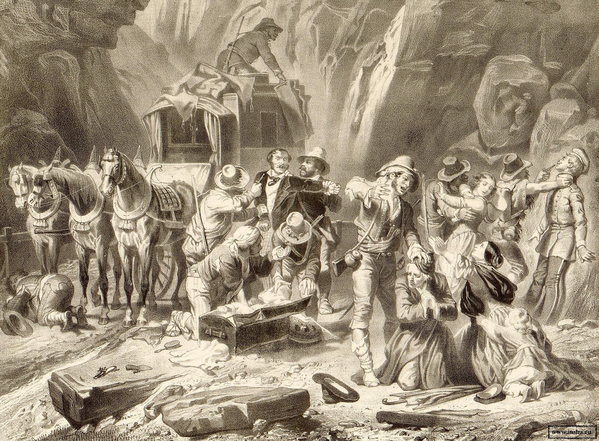 | Нападение разбойников на дилижанс в ущелье. Неизвестный литограф. Италия (?), XIX в. бумага, литография, 355х490 мм. ГЭ |