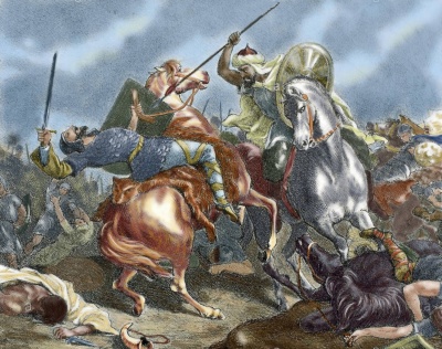 Как ни странно, о ходе и подробностях этого сражения – вне всякого сомнения, одного из важнейших в мировой (и уж, во всяком случае, в европейской истории) – нам по сей день известно очень (так и хочется сказать – до обидного) мало. В этом повинны как цветистая фантазия арабских летописцев, так и очередная внутренняя смута, раздиравшая вестготскую державу. На «арабской» (возьмем это слово в кавычки, учитывая ничтожно малый процент собственно арабов в войске Тарика) стороне в сражении при Гвадалете (или, как его еще называют – битве при Хересе де ла Фронтера) приняло участие, по разным подсчетам, от 10 до 20 тысяч человек. А на вестготской стороне – от восьми до 10 тысяч. Причем не все они, судя по всему, дрались за царя Родериха в полную силу. Часть правого крыла вестготского войска, которым командовали представители знатного рода, оппозиционно настроенного по отношению к царю, и вовсе перешла на сторону арабов. Сражение, продолжавшееся, якобы, пять, шесть, семь или даже восемь дней, было к 25 (или 26) июля окончательно проиграно вестготами. Родерих пал либо в самом сражении, либо в ходе одной из стычек, которыми сопровождалось преследование разбитых готов победоносными «магометанами» (возьмем в кавычки и это слово, с учетом присутствия в рядах войска Тарика огромного числа «ромеев» Юлиана, о чьем переходе в ислам источники не сообщают!) в последующие дни. По некоторым сведениям, царь готов утонул при переправе через реку Гвадалете... Увы - готские кони, дротики и копья, все плоды военных упражнений, которыми вестготы так усердно занимались под властью столь многих царей, не принесли им победы. Ибо были давно утрачены внутренняя спайка и политическая сплоченность вестготской державы. Под тучами стрел воинов Тарика ибн Зияда центр (или, как говорили наши древнерусские предки – чело) вестготской рати обратился в бегство. А ее фланги, или крылья (а, говоря по-древнерусски – полки правой и левой руки) оставались безучастными к разгрому центра, поскольку предводители их (Оппа и Сисиберт – сыновья царя Витицы, отстраненного от власти Родерихом), возможно, вовсе не желали победы своему царю. И потому то ли тоже побежали, то ли перешли на сторону Тарика. Проигранная готами в 711 г. битва при Гвадалете открыла воинам ислама путь в христианскую Европу (по зловещей иронии судьбы – при активном содействии кафоликов-«ромеев»). Памятуя о всемирно-историческом значении этого события, бельгийский историк Анри Пиренн датировал именно 711 г. конец Античности и наступление Средневековья.