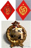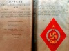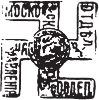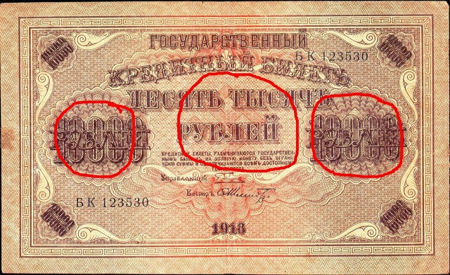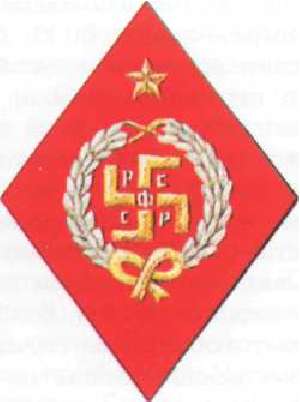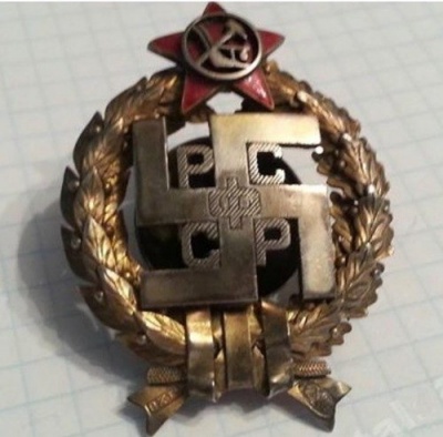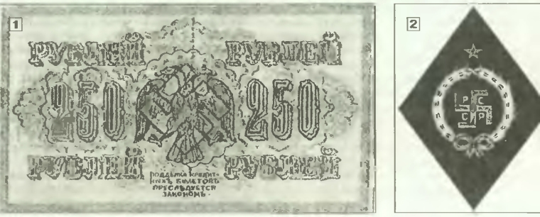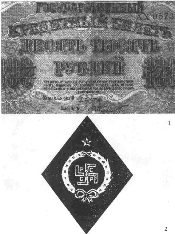 1941 г.!), но и на денежных знаках разного достоинства уже ленинского правительства Советской России (в частности, на 5000- и 1000-рублевых купюрах-«пятаковках» - уже безо всякого, даже «ощипанного», орла ), на печатях Советов солдатских и рабочих депутатов в РСФСР (например, Московского губернского - по крайней мере, с 1918 по 1920 г.), на командирских нарукавных нашивках и нагрудных знаках целого ряда частей «рабоче-крестьянской» Красной Армии (см. цветную фотографию такого знака советского красного командира, помещенную нами, в качестве иллюстрации, слева в заголовке настоящей миниатюры), на головных уборах калмыцких кавалерийских частей Красной Армии в 1919-1921 гг. (и даже в гербе советской Калмыцкой республики!), то аналогии начинают приобретать все более странный и зловещий характер.
