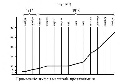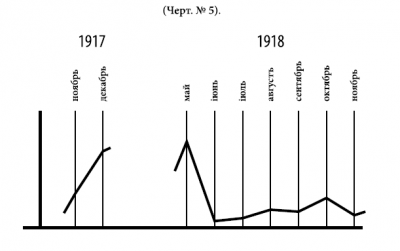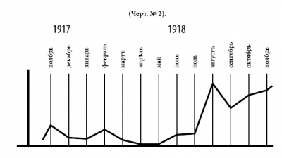 Чертеж № 2, кривая относительного (месячного поступления) показывает месяцы максимального и минимального прибытия офицеров Генерального штаба в Добровольческую армию, причем к числу первых относятся: август — ноябрь, ко вторым — январь, март и май с минимальным и апрель краевым поступлением; последние три месяца составляют период кубанского похода и первые дни отдыха, когда слухи о том, что армия цела, не успели получить еще широкого распространения.