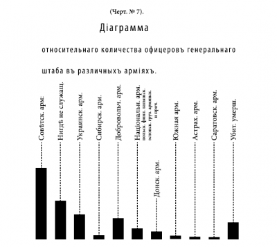 Чертеж № 6 показывает, что из числа наличных офицеров Генерального штаба, состоящих в Донской армии, 1-е место по количеству занимают генералы, составляя до 50%; 2-е место падает на штаб-офицеров — оного 46% и 3-е место приходится на обер-офицеров — 4%.