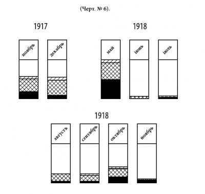 Наибольшее количество генералов дал ноябрь 1917 г. и ноябрь 1918 г.; причем в первом случае это объясняется прибытием в этом месяце Быховских узников, наибольшее количество штаб- и обер-офицеров приходится на август 1918 г.