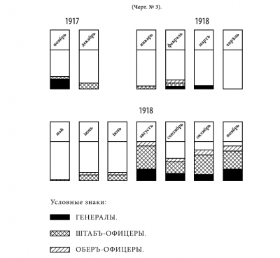 Чертеж № 3, иллюстрируя более наглядно вопрос о пополнении Добровольческой армии офицерами Генерального штаба, вместе с тем показывает, что из числа всех прибывших в Добровольческой армии 1-е место по количеству занимают штаб-офицеры, составляя около 55% всего состава; 2-е место занимают генералы — около 28%; 3-е место приходится на долю обер-офицеров, составляющих около 17%. Нужно заметить, что вообще обер-офицеров Генерального штаба имеется исключительное количество.