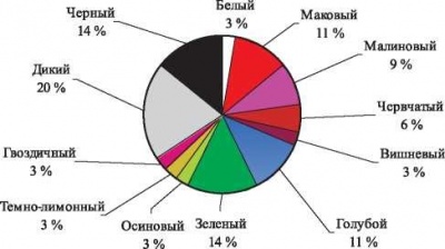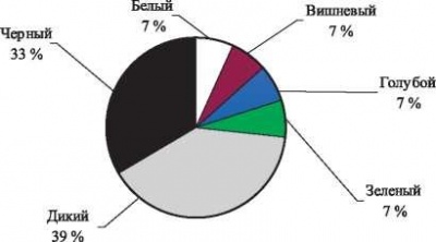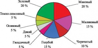 Цветовая гамма этой одежды (см. диаграммы 1-3 на цветной вклейке) тоже отражает переходный характер периода только еще начинавшейся европеизации - в целом в верхней одежде по-прежнему доминируют яркие цветовые тона, характерные для праздничного костюма традиционных обществ, с довольно большой долей оттенков красного (почти треть, 29 %). Яркие тона характерны прежде всего для «потешных» кафтанов Петра, где они безусловно преобладают - оттенки красного составляют здесь почти половину цветовой гаммы (45 %). Появившийся в основном уже во второй половине 1691 г.