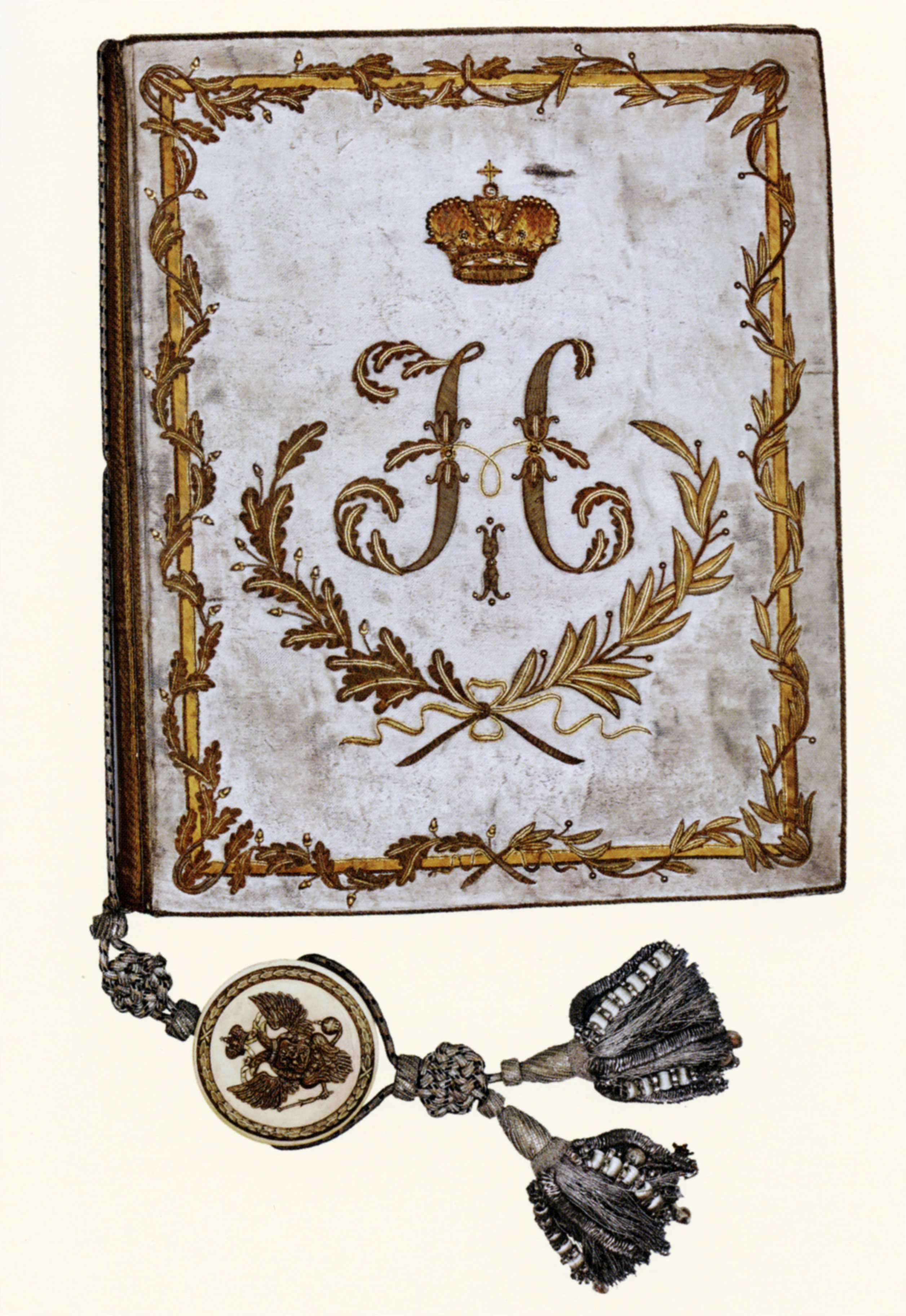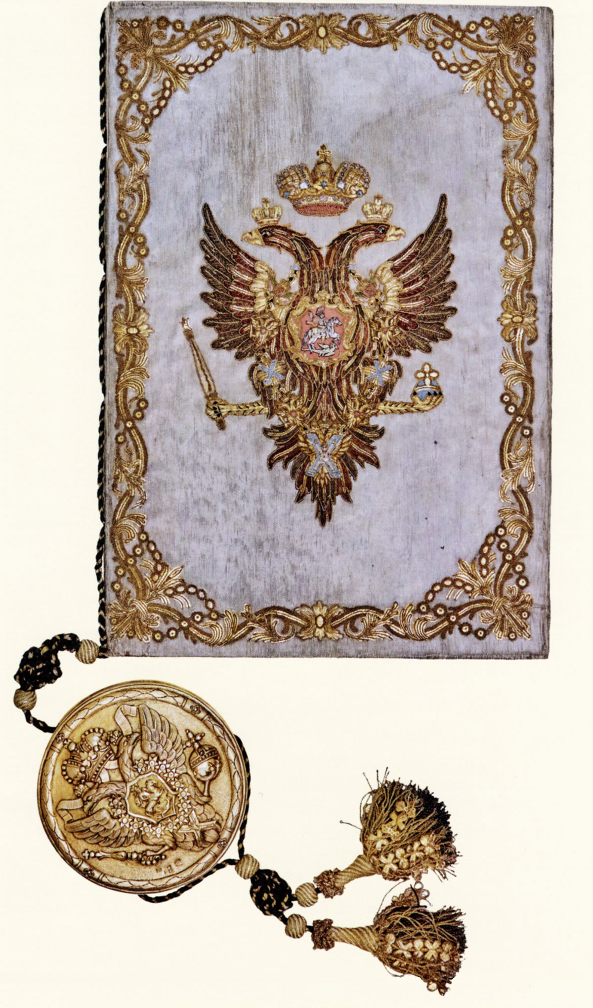 Расходы на изготовление Статута ордена Св. Георгия в Коллегии иностранных дел, которая ведала орденскими делами, составили 173 рубля 25 копеек. В эту сумму, оплаченную из Бриллиантовой комнаты императрицы, входили стоимость пергамена, шитье золотом, изготовление печати и серебряной кустодии (футляра) для нее. Судя по клеймам, кустодию для восковой печати изготовил серебряных дел мастер Захарий Дейхман в 1768 г. Оформление Статута было поручено художнику Гавриилу Игнатьевичу Козлову. Учитывая «для отдачи пожалованных живописцу Козлову за труд его в живописных украшениях того же статута 100 червонных на 250 рублев», общая сумма увеличилась до 423 рублей 25 копеек. Представленный к оплате счет императрица Екатерина II подписала в 1769 г. (РГИА. Ф. 468. Кабинет Е.И.В. Оп. 1. 4. 2. Д. 3883. Л. 170.).