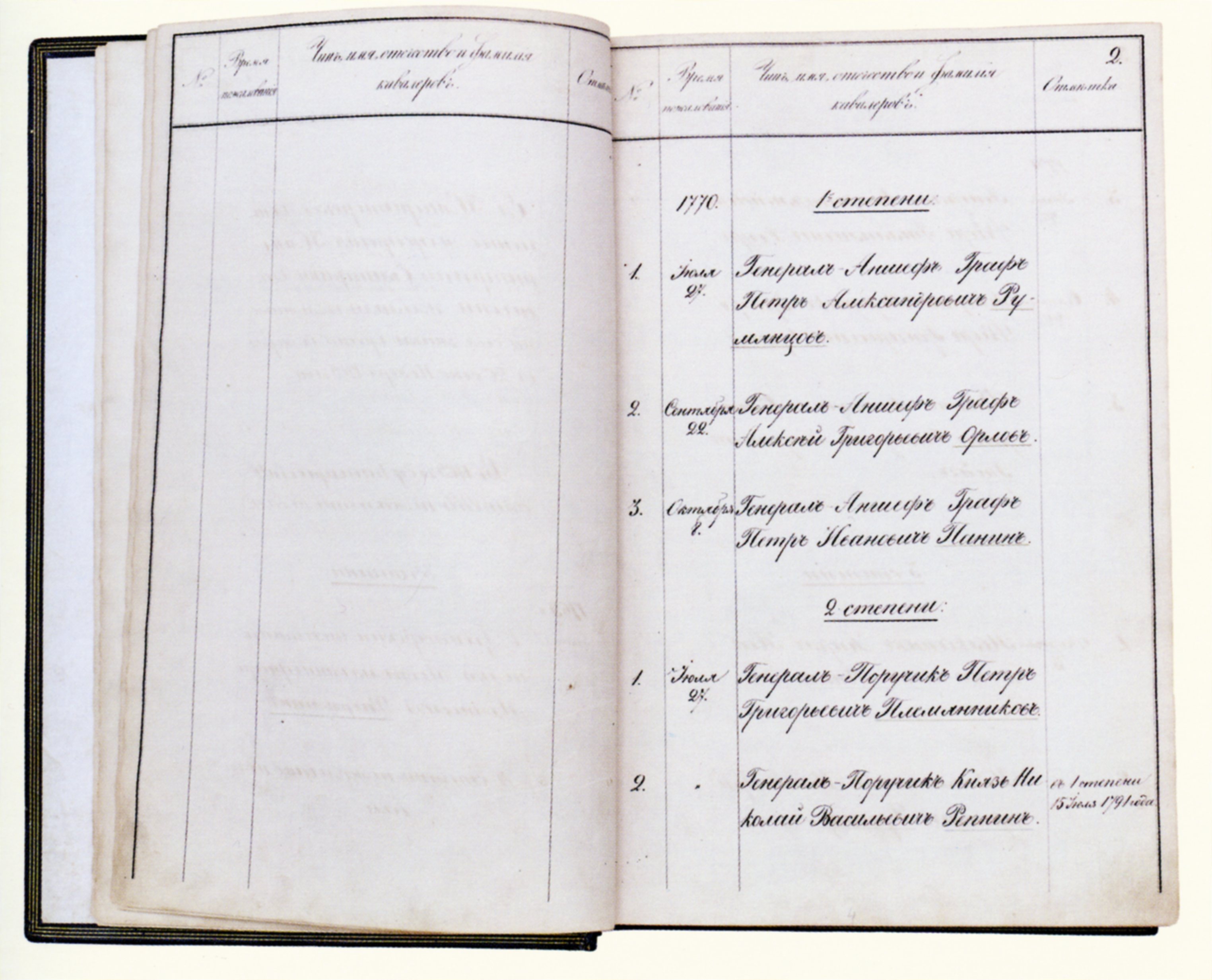 По понятным причинам знаки ордена Св. Георгия были особенно востребованы во время ведения военных действий. Императрица Екатерина II как гроссмейстер ордена утверждала награждения высшими степенями. Любопытная запись периода Русско-турецкой войны 1787-1791 гг. сохранилась в документах Капитула орденов: «Истребованные сего ноября 24 дня (1788 г. - Л.Г.) пополуночи во 2-м часу для доставления в канцелярию господина гофмейстера и кавалера графа Александра Андреевича Безбородки ко отправлению к пожалованному в кавалеры военного ордена в 2-ю степень принцу Нассау-Сиген орденские той степени знаки: крест большой один, лента среднего сорта в один с половиною аршин, звезда одна, статут 1» (РГИА. Ф. 468. Кабинет Е.И.В. Оп. 1. Ч. 2. Д. 3885. Ф. 496. Оп. 3. Д. 1390. Л. 4.). Речь идет о Карле Генрихе, принце Нассау-Зигенском - французском аристократе, адмирале российского гребного флота. Во время Русско-турецкой войны 1787-1791 гг. он был принят на русскую службу. Под его командованием 17-18 июня 1788 г. Днепровская гребная флотилия разбила турецкий флот под Очаковым, за что принц был представлен к награждению II степенью ордена, которое было подписано императрицей 24 ноября 1788 г. Остатки турецкого флота после поражения от Днепровской эскадры были уничтожены 3 июля того же года Федором Федоровичем Ушаковым, которому 20 декабря был выдан такой же комплект наград II степени ордена Св. Георгия (РГИА. Ф. 468. Кабинет Е.И.В. Оп. 1. Ч. 2. Д. 3885 Л. 15.). После награждения Ф.Ф. Ушаков был назначен командующим Севастопольской эскадрой и портом, а в 1789 г. произведен в контр-адмиралы.