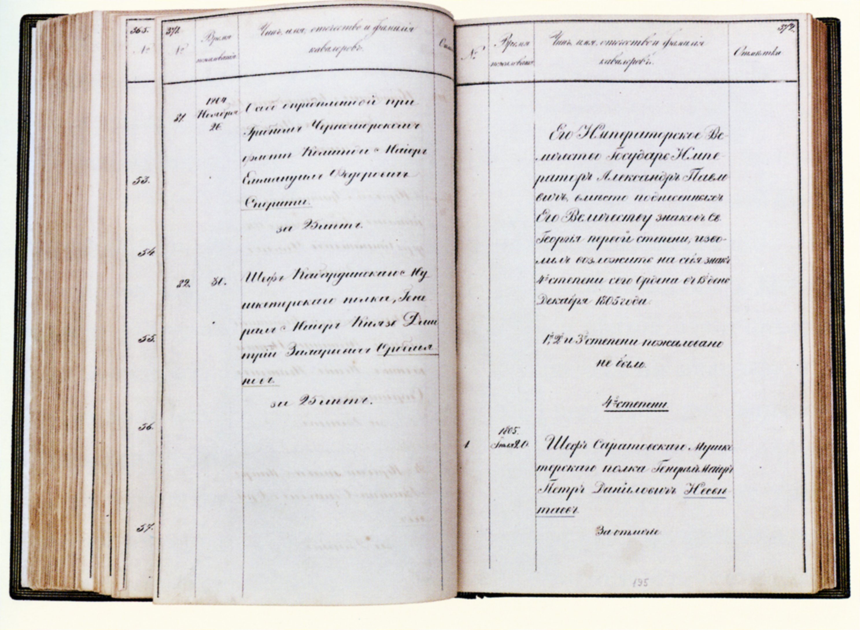 В связи со строительством Большого Кремлевского дворца в Москве и размещением в нем орденских залов, с 1849 г. императором Николаем I было учреждено правило отмечать на мраморных досках имена георгиевских кавалеров. Орденской думой специально для этого были составлены перечни награжденных орденом Св. Георгия, начиная с его учреждения. Эти списки были заключены в сафьяновый переплет с золотым тиснением и золотым обрезом. Ныне они хранятся в архиве Музеев Московского Кремля. Традиция отмечать на мраморных досках имена георгиевских кавалеров была прервана в 1885 г.