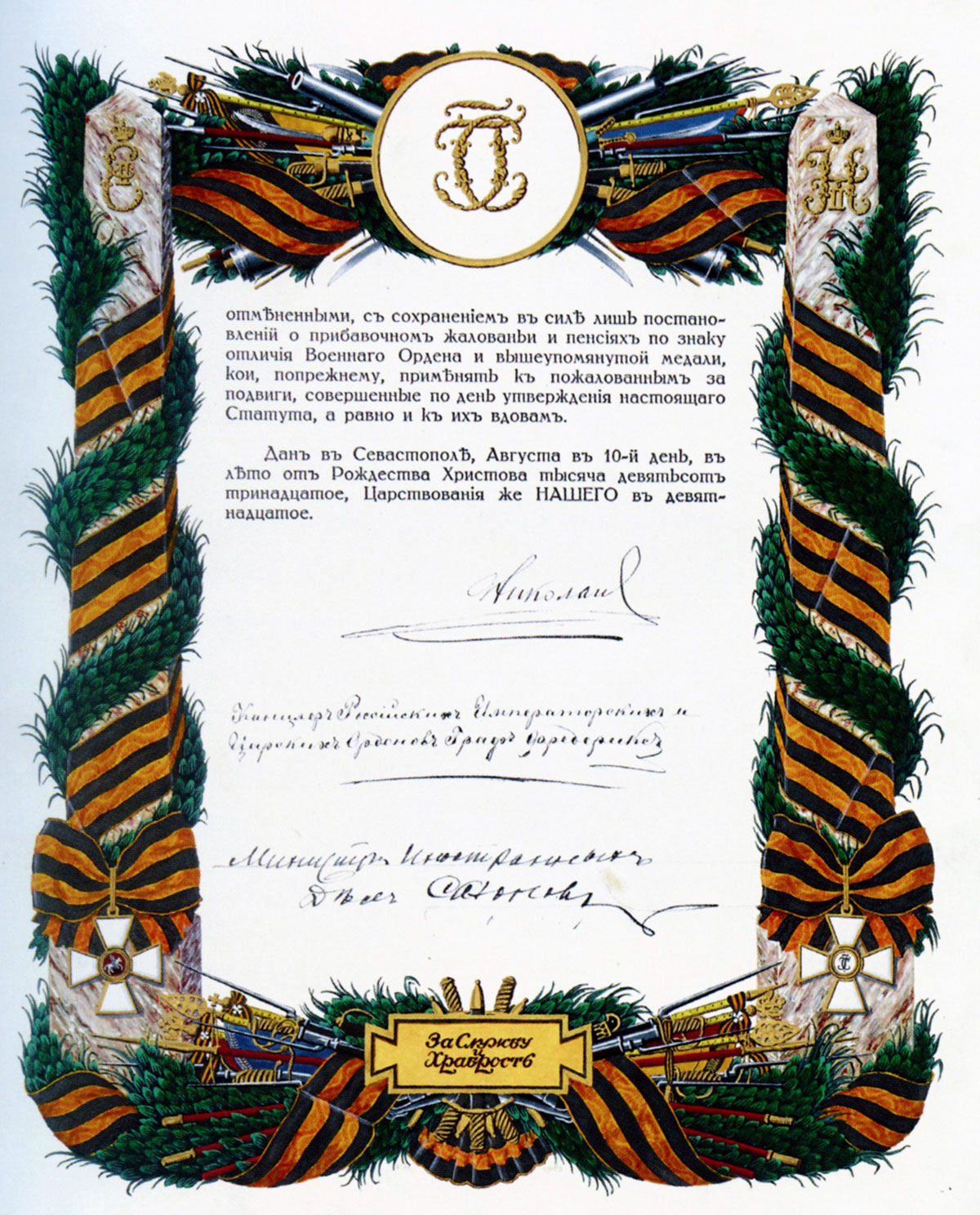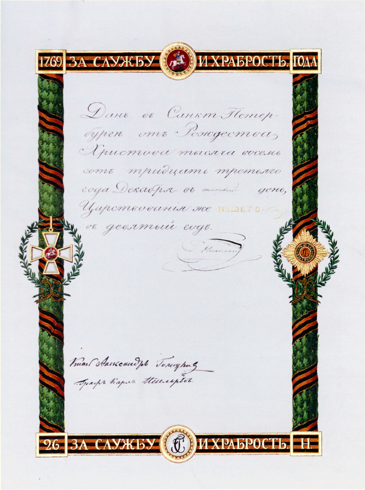 В 1833 г. был издан дополненный новыми положениями Статут ордена Св. Георгия, подписанный императором Николаем I. В нем содержалось более детальное, для каждого рода войск, описание воинских доблестей, за которые производилось награждение. Подробно был расписан срок службы, требуемый для награждения за выслугу лет, а также прибавилось требование участия хотя бы в одном сражении для получения ордена Св. Георгия IV степени за выслугу лет.