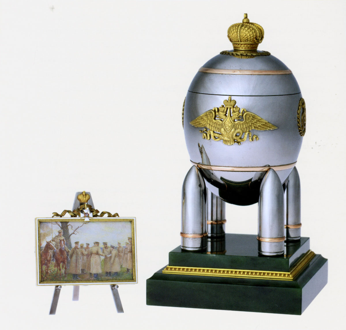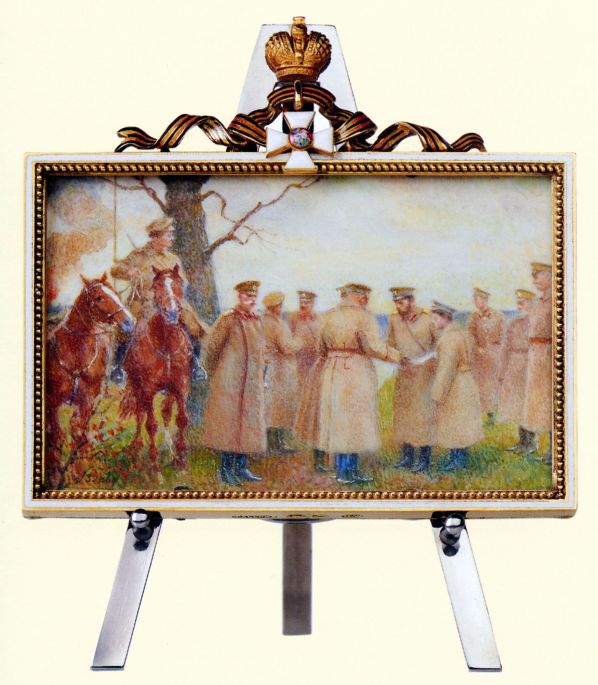 Император Николай II был награжден IV степенью ордена 25 октября 1915 г. за пребывание в зоне действенного артиллерийского огня. В память об этом событии император заказал фирме «Фаберже» пасхальное яйцо, которое он преподнес императрице Александре Федоровне на Пасху в 1916 г. Стальное яйцо украшено золотой императорской короной, накладными изображениями Герба Российской империи и святого Георгия Победоносца. Па яйце стоят дата «1916» и монограмма императрицы Александры Федоровны А©. Подставка для него выполнена в виде четырех снарядов, укрепленных на постаменте из нефрита. В само яйцо вложена миниатюра, закрепленная на мольберте с монограммой императрицы Александры Федоровны. Па ней изображен Николай II с сыном цесаревичем Алексеем на позиции русских войск. Миниатюра вставлена в золотую раму, украшенную императорской короной, лентой и знаком ордена Св. Георгия. Цесаревич Алексей в 1916 г. был награжден серебряной Георгиевской медалью IV степени.