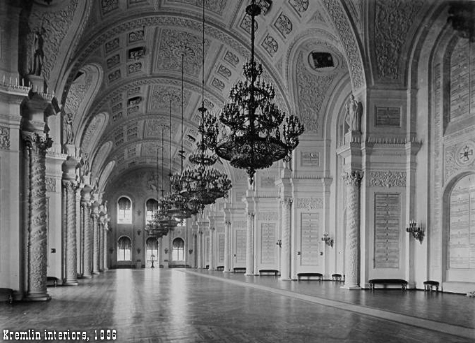 Георгиевский зал - самый большой из парадных залов Кремлевского дворца. Его площадь составляет 1 200 квадратных метров. Декор зала решен в бело-золотой гамме, потолок перекрыт кессонированным сводом, опирающимся на восемнадцать пилонов, к которым приставлены полые колонны. Над колоннами помещены скульптуры работы И.П. Витали, представляющие аллегорические изображения областей, вошедших в состав Российского государства. Зал уподоблен музею русской воинской славы. Его стены украшены изображениями знаков ордена Св. Георгия и мраморными досками с высеченными золотом названиями отличившихся воинских частей и списками георгиевских кавалеров. Паркет, отличающийся необыкновенной красотой и великолепным рисунком орнамента, набранного более чем из двадцати пород дерева, и двери зала выполнены по рисункам академика Ф.Г. Солнцева.