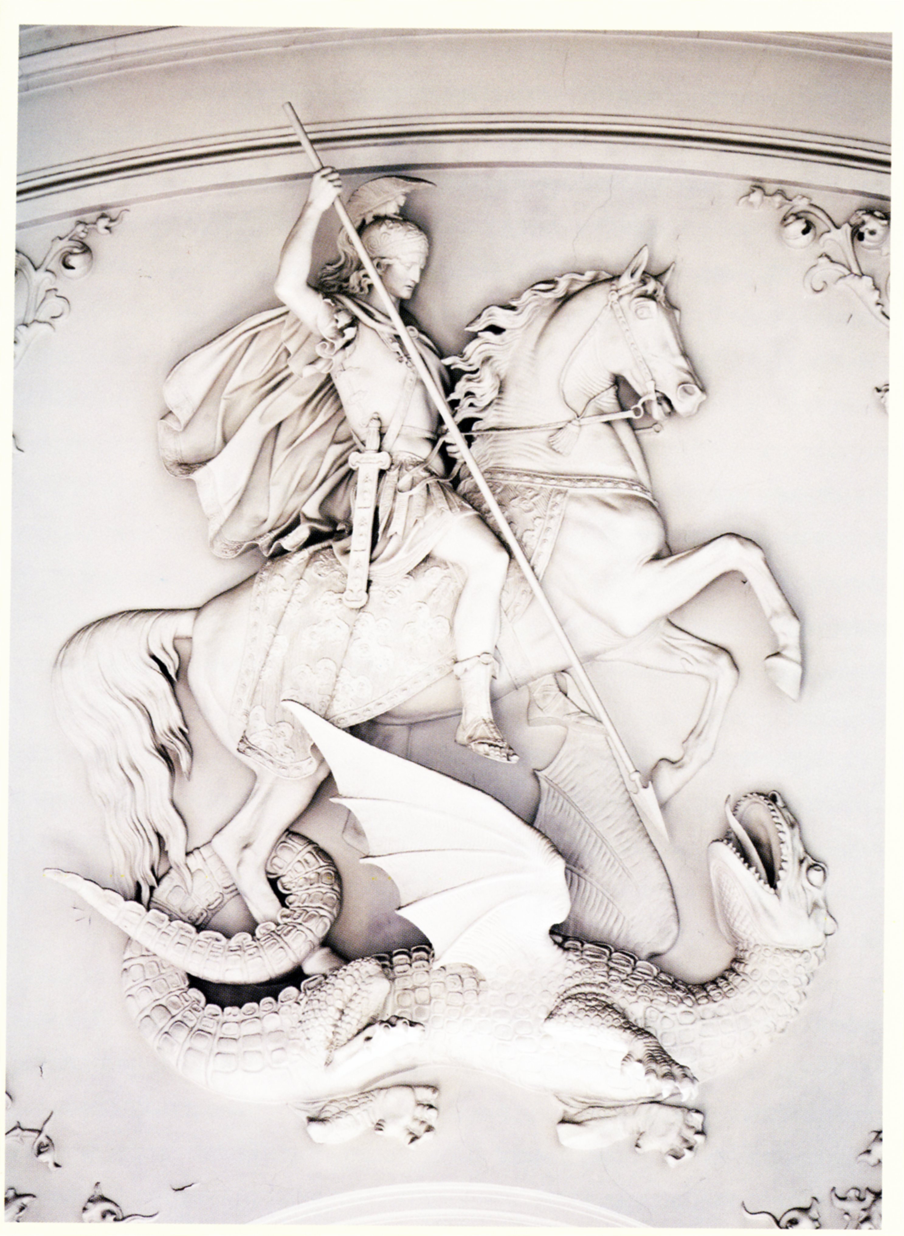Екатерина II придавала большое значение выбору святого покровителя ордена: святой Георгий не только издавна почитался на Руси как защитник воинов, но и ассоциировался с узнаваемой геральдической фигурой. Изображение русского государя в виде всадника, поражающего копьем дракона, на государственном гербе часто воспринималось (а на Западе трактовалось почти однозначно) как изображение святого Георгия. Однако лишь в 1710-х гг., с установлением имперской символики, включавшей персональное обозначение особы государя, всадник на российском гербе впервые стал называться святым Георгием. Спустя еще некоторое время он закрепился на Государственном гербе, на груди двуглавого орла, но уже в новом качестве - официальной эмблемы Московской губернии.