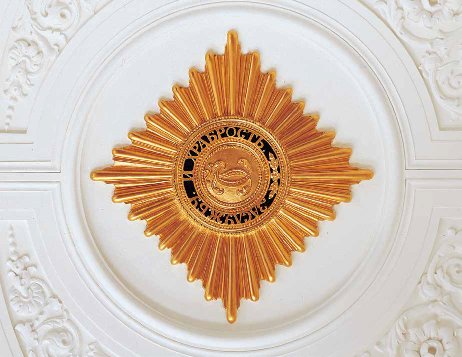 При Екатерине II в Зимнем дворце с особой пышностью проходили дворцовые приемы кавалеров четырех высших российских орденов в дни святых, имена которых они носили. Чтобы поднять престиж российский орденов, для проведения орденских празднеств императрица заказала в 1777 г. на подмосковном заводе Ф.Я. Гарднера четыре именных орденских сервиза с изображениями орденских знаков по эскизам художника Г.И. Козлова, который, как мы уже знаем, оформил Статут ордена Св. Георгия. В счетах из Императорского Кабинета от 1778 г. отмечено: «профессору Козлову за рисунки фарфоровых десертных сервисов, делающихся на Гарднеровой фабрике, - 100 руб.», а также «фабриканту Гарднеру в счет суммы за три фарфоровых десертный сервиса к выданным 3 000 рублям еще 5 000» (РГИА. Ф. 468. Кабинет Е.И.В. Оп. 1. Ч. 2. Д. 3893- Л. 7 об., 11.), - здесь речь идет именно о сервизах орденов Св. Андрея Первозванного, Св. Александра Невского и Св. Георгия. Сервизы использовали только раз в год на парадном обеде в честь орденского праздника в Зимнем дворце, где