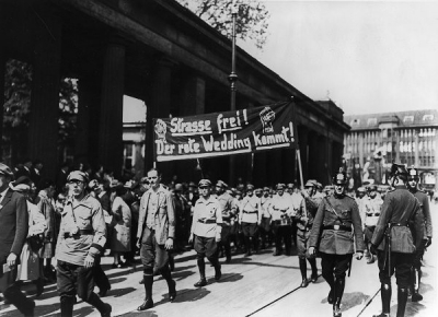 На фотографии, помещенной нами в качестве иллюстрации к настоящей миниатюре, запечатлен марш колонны военизированной организации Коммунистической партии Германии (КПГ) - «Союза Красных Фронтовиков» - берлинского района Веддинг. Надпись на украшенном по бокам эмблемой «Ротфронта» - сжатым кулаком - плакате «ротфронтовцев»: «Освободить дорогу! Красный Веддинг идет!» (Strasse frei! Der Rote Wedding kommt!) удивительным образом перекликается со словами из нацистской «Песни Хорста Весселя»: «Освободить дорогу коричневым батальонам!» (Die Strasse frei den braunen Bataillonen!). Как видно, таков уж был дух времени...
