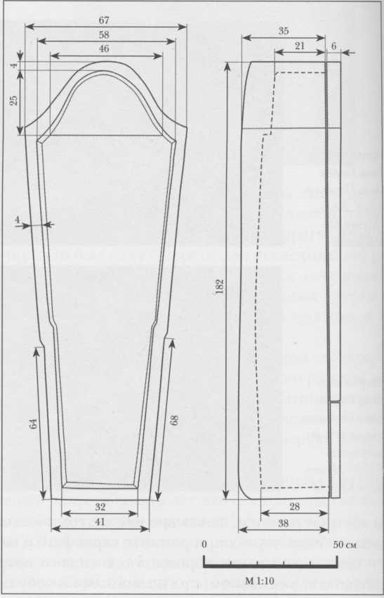 Следует указать на некоторые особенности устройства гроба. Прежде всего, отметим небольшие уступы на его боковых стенках, дополнительно (вместе с оголовьем) имитирующие контуры человеческого тела. Подтеска прослеживается на всю высоту стенок саркофага, на расстоянии 64-68 см от его ножного торца. Интересно, что уступы повторены и на крышке гроба, но значительно ближе к ножной части; они не совпадают с подтесками на саркофаге и весьма незначительны (0,1-1,5 см), но прослеживаются отчетливо (ил. План и вид в разрезе саркофага великой княгини Софы Фоминичны Палеолог. Сост. Т.Д. Пановой, рис. Е.Ю. Бахаревой. Музеи Московского Кремля).