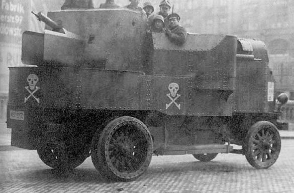 Несколько слов о вооружении германских белых добровольцев. С учетом того, что им приходилось вести боевые действия по преимуществу в городских условиях, вооружение фрейкоровцев ограничивалось в основном стрелковым оружием – винтовками, карабинами, пистолетами и револьверами, тяжелыми и легкими пулеметами, минометами и огнеметами. Кроме того, у них имелось некоторое количество пистолетов-пулеметов "Бергман" МР-18. В боях на улицах германских городов, где фактически решалась судьба мировой революции, "о необходимости которой так долго говорили большевики", но которая, к счастью, не совершилась, активно использовались как ручные гранаты-"бутылки", так и гранаты-"лимонки", саперные лопатки и "окопные кинжалы" – "узкие, шилообразные, похожие скорее на средневековые итальянские стилеты, и такие острые, что, вонзенные в рукопашной схватке в глаз противника, мгновенно ударялись изнутри о черепную кость врага" (как писал Людвиг Ренн в своей дилогии "Война"/"После войны").