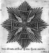2) Звезда золотая; в средине звезды изображен пламенистый крест, имеющий по краям три узенькие полоски, из коих средняя красная, а прочие две золотыя; вокруг же него на синей широкой полосе находится девиз: pro Fide, Rege et Lege (за Веру, Царя и Закон).