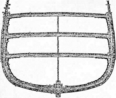 Корма Деревянного судна бывала прямая, круглая или эллиптическая. Набор кормы составляют транцы (фиг. Ill, 6), — горизонтальные брусья, крепящиеся своими концами к шпангоутам, а серединою нарезающиеся на фалстарнпост; верхний из этих брусьев, вин-транец, приходится выше жилой палубы, ниже его помещается дек-транец, а между ними — филиптранцы. Выше вин-транца корма имеет уклон назад для того, чтобы закрыть голову руля, проходящего внутрь судна. Стена судна, образующая этот уклон, составляется из кривых деревьев, называемых контр-тимбер-сами (фиг. Ill, 12) и наклон, брусьев — старн-тимберсов (9). Ниже дек-транца помещается несколько дополнительных транцев, число которых зависит от образования кормы: при полной корме их больше, нежели при острой.