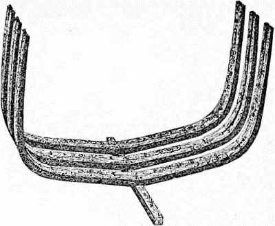 Первые устанавливаются перпендикулярно килю и идут в средней части судна; поворотные шпангоуты (фиг. 3) ставятся в оконечностях; они располагаются наклонно к килю, сохраняя по возможности нормальное положение к обшивке, чтобы устранить острые срезы (малки) и избежать расщепления при вбивании гвоздей.