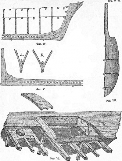 Ахтерштевень (фиг. V) служит основанием кормы и также составляется из 2 частей: старнпоста 4 и фалстарнпоста 5, устанавливаемых на киль и соединенных с ним шипами.