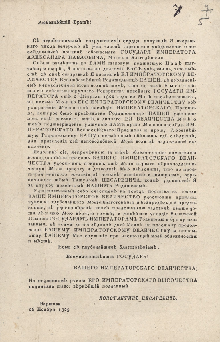 В Варшаве роковое известие из Таганрога получено вечером 25-го ноября (7-го декабря). Цесаревич на другой день в письмах на имя Императрицы Марии Феодоровны и Великого князя Николая Павловича подтвердил свое отречение от престола, последовавшее 2-го (14-го) февраля 1822 года, и признал Императором Великого князя Николая Павловича. Между тем известие о постигшем Россию несчастии получено было в Петербурге 27-го ноября (9-го декабря) во время молебствия за здравие Государя в большой церкви Зимнего дворца. Великий князь Николаи Павлович тотчас присягнул Императору Константину и подписал присяжный лист. С этого дня между двумя братьями началась неслыханная в истории борьба «не о возобладании властию, а об отречении от неё». Междуцарствие окончилось только 14-го (26-го) декабря вступлением на престол Императора Николая Павловича. Когда Меттерних получил известие о кончине Императора Александра, он высказал мнение: «Ou je me trompe fort, ou bien l’histoire de Russie va commencer là où Tient de finir le roman».