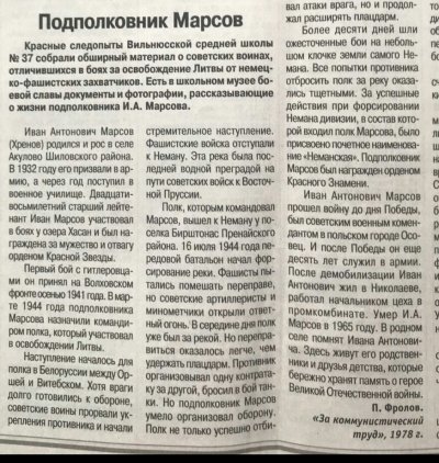 Дядя Ваня Марсов, муж тети Шуры, после войны был комендантом какого-то города в Польше. Потом его перевели в город Лиду. В районной газете была перед 23 февраля публикация о дяде Ване Марсове.