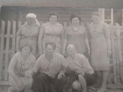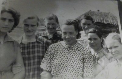 Фото из семейного альбома Луниной Н. В. Дубровка. Стоят слева направо: Вера Николаевна Дадонкина (Панина), ее сестра Анна Николаевна Мезина (Панина), Мария Филипповна Попова (Лукашина), сестра Луниной Клавдии Филипповны, Лунина Валентина Петровна (Дадонкина). Сидят Таисия Петровна Лесик (Дадонкина), Лунин Владимир Иванович, Тамара Петровна Гонтарь (Дадонкина).