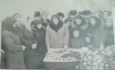 Фото. Похороны Веры Николаевны Дадонкиной (Паниной). Возле гроба в светлом пальто — Таисия Дадонкина, дочь Веры, рядом с ней слева — Мария Ивановна Панина (Уварова), мать Веры, рядом слева в белом платке — Александра Николаевна Марсова (Панина), сестра Веры, рядом слева — Мезина Анна Николаевна (Панина), сестра Веры, за Марией Ивановной стоит Владимир Николаевич Панин, брат Веры, возле него в светлой шапке — Пчелинцев дядя Володя, за тетей Таей — Юрий Петрович Панин, племянник Веры, за Таей выглядывает Пчелинцева баба Поля, рядом с тетей Таей возле гроба стоит Надежда и ее брат Николай Лунины, за ними стоит их мать, Валентина Петровна Лунина (Дадонкина), дочь Веры, рядом с ней, Тамара Петровна Гонтарь (Дадонкина), дочь Веры, за ними стоит Владимир Иванович Лунин, рядом Петр Николаевич Панин, брат Веры, рядом с Тамарой — Уварова тетя Лиза, а за ней Екатерина Уварова. Екатерина и Лиза — двоюродные сестры Веры.