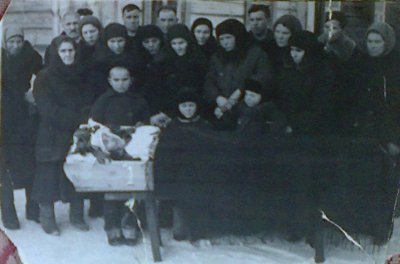 Фото. Предположительно, похороны Николая Федотовича Панина. В изголовье стоит Мария Ивановна Панина (Уварова), вторая — Тамара Дадонкина, потом Елизавета Панина, потом? , потом Поля Пчелинцева, за ней жена дяди Вани Тимакина, Мария Павловна, потом Вера Николаевна Дадонкина, потом Валентина Дадонкина, потом Раиса Васильевна Панина (Земцова), последняя — Паиса Емельяновна Тимакина. Мужчина с усами-? , потом Павел Панин, Иван Яковлевич Тимакин, Петр Николаевич Панин, Александр Яковлевич Тимакин. Из детей первый — Юра Панин, потом Павел Панин, третий — Сергей Панин, сын дяди Паши.