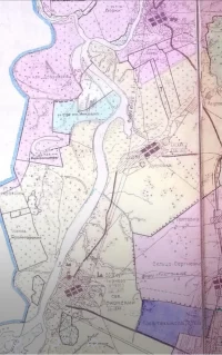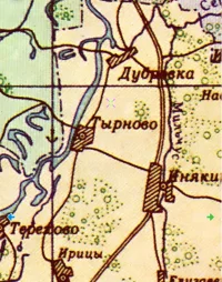 Здесь тоже Пьяный лес не отмечен. Я очень долго ее рассматривала в интернете, и мое предположение, что квадратики по середине села это правление совхозов и администрация, а кружочек это похоже на точку телефонной связи, а черные точки, выстроенные в ряды это дубовые посадки. Вообще, я думаю, что это техническая карта. Думаю, что это не топографическая карта, иначе были бы отображены и реки и озера, ну и Пьяный лес, а техническая, здесь помечены фидерные линии.