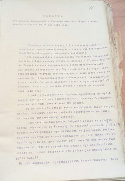 В феврале 1912 года управляющий Сердюков пишет письмо в Земскую Управу и возмущается неправильным поведением членов Управы в деле строительства медпункта в Сергиевке.