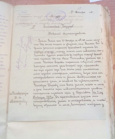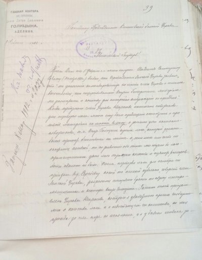 Закупленный лес начинает гнить без употребления. Петр Павлович Голицын пишет 7 декабря 1911 года из Санкт-Петербурга (Алексеевская дом 5. Телефон 46747) возмущенное письмо Мансурову Н.А.