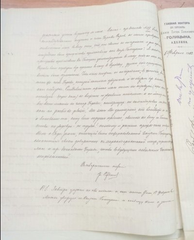 Как-то приблизительно в 1975 или 1976 году дома мама мне показывала письмо управляющего Голицынским имением. Письмо было личного характера. Почерк каллиграфический, красивый и разборчивый. Письмо было из личной переписки, но с кем, не знаю. Читать его с ятями и ижицами было трудно. Откуда и как оно появилось у мамы и что с ним произошло потом - я не знаю.
